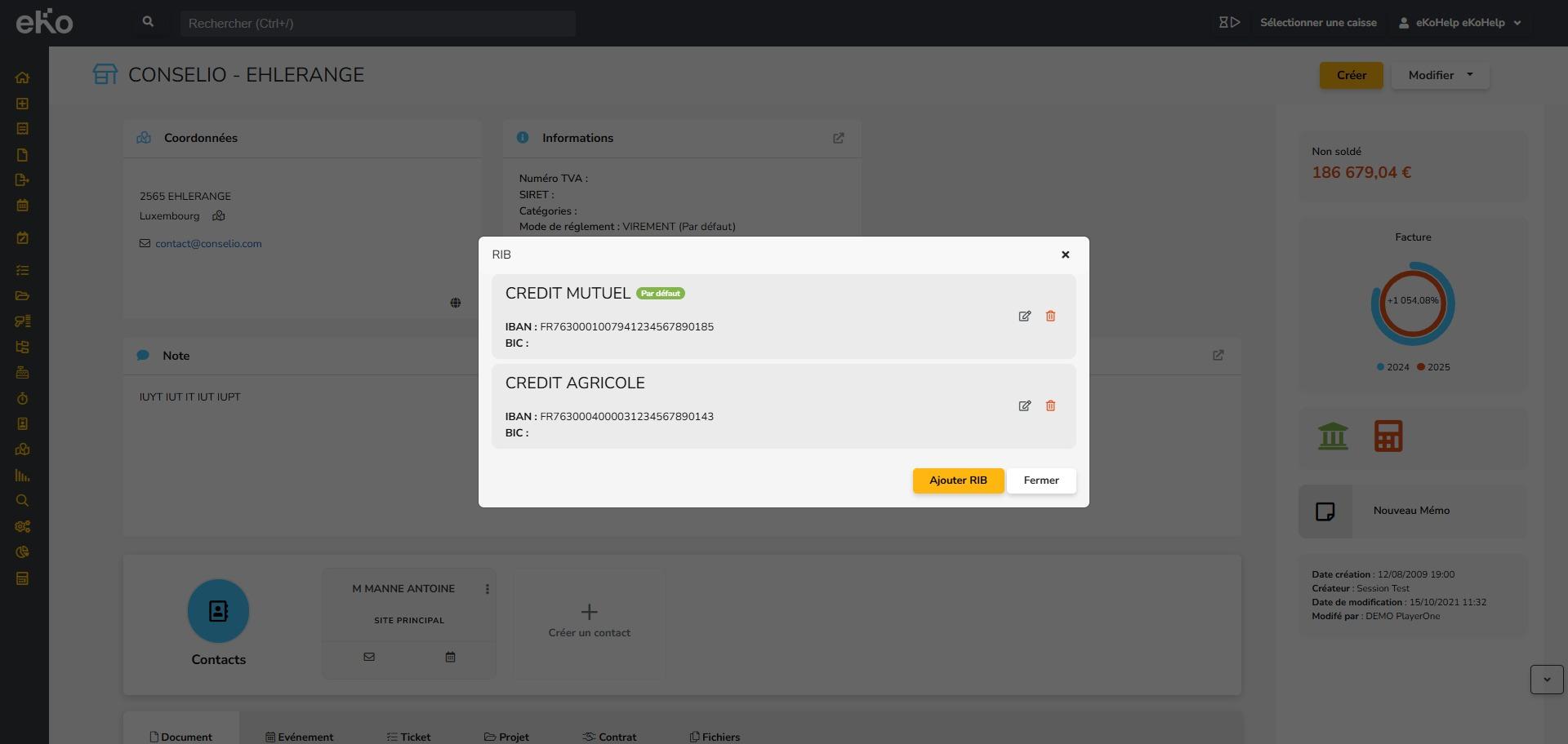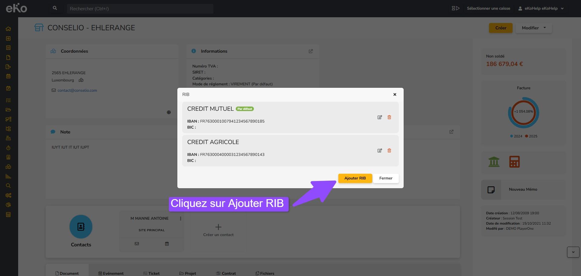 Note : il est possible qu’une fenêtre intermédiaire s’ouvre si des RIB sont déjà présent sur la fiche client, il suffit dans ce cas de cliquer sur Ajouter RIB.
