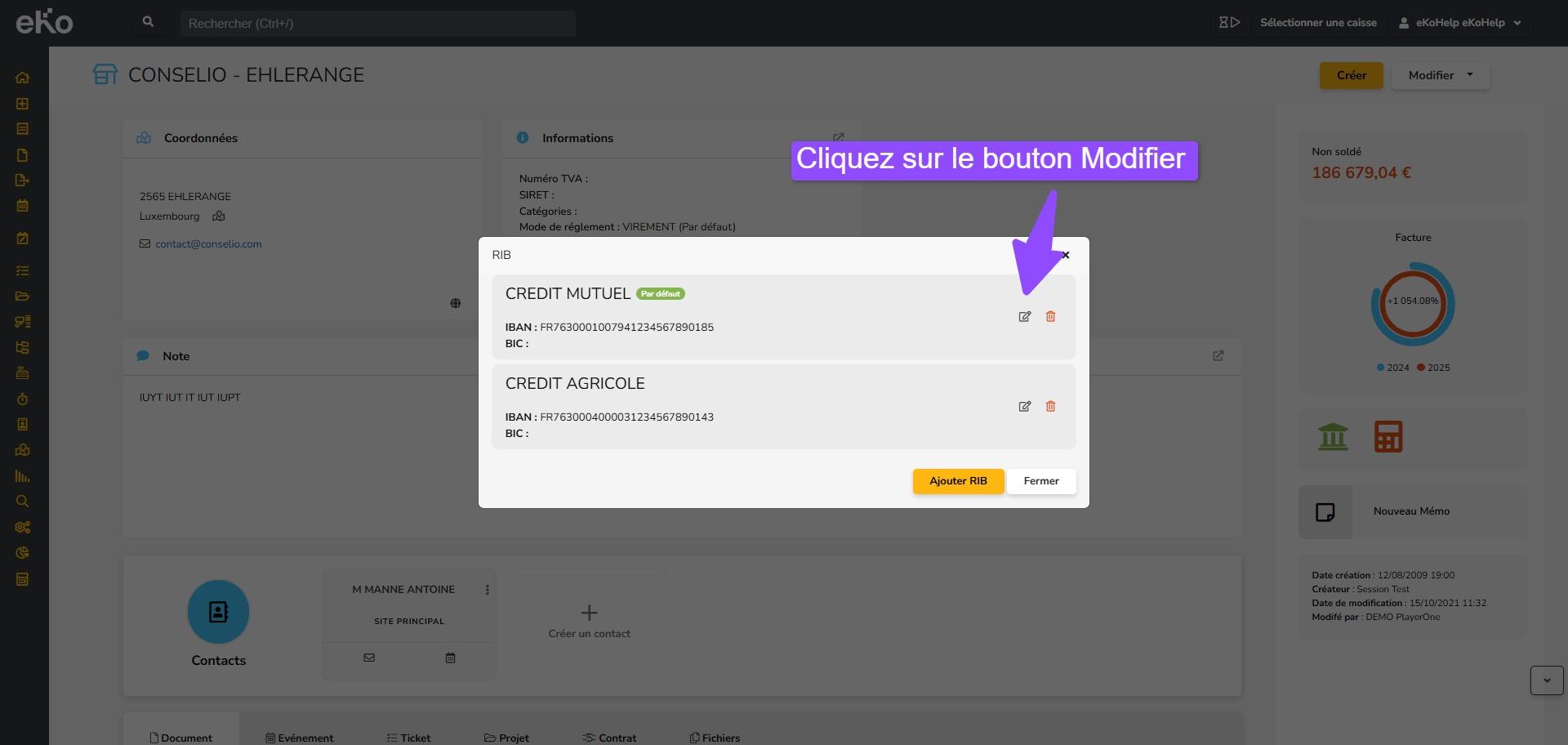 - Pour modifier un RIB, cliquez sur l’icône Modifier.