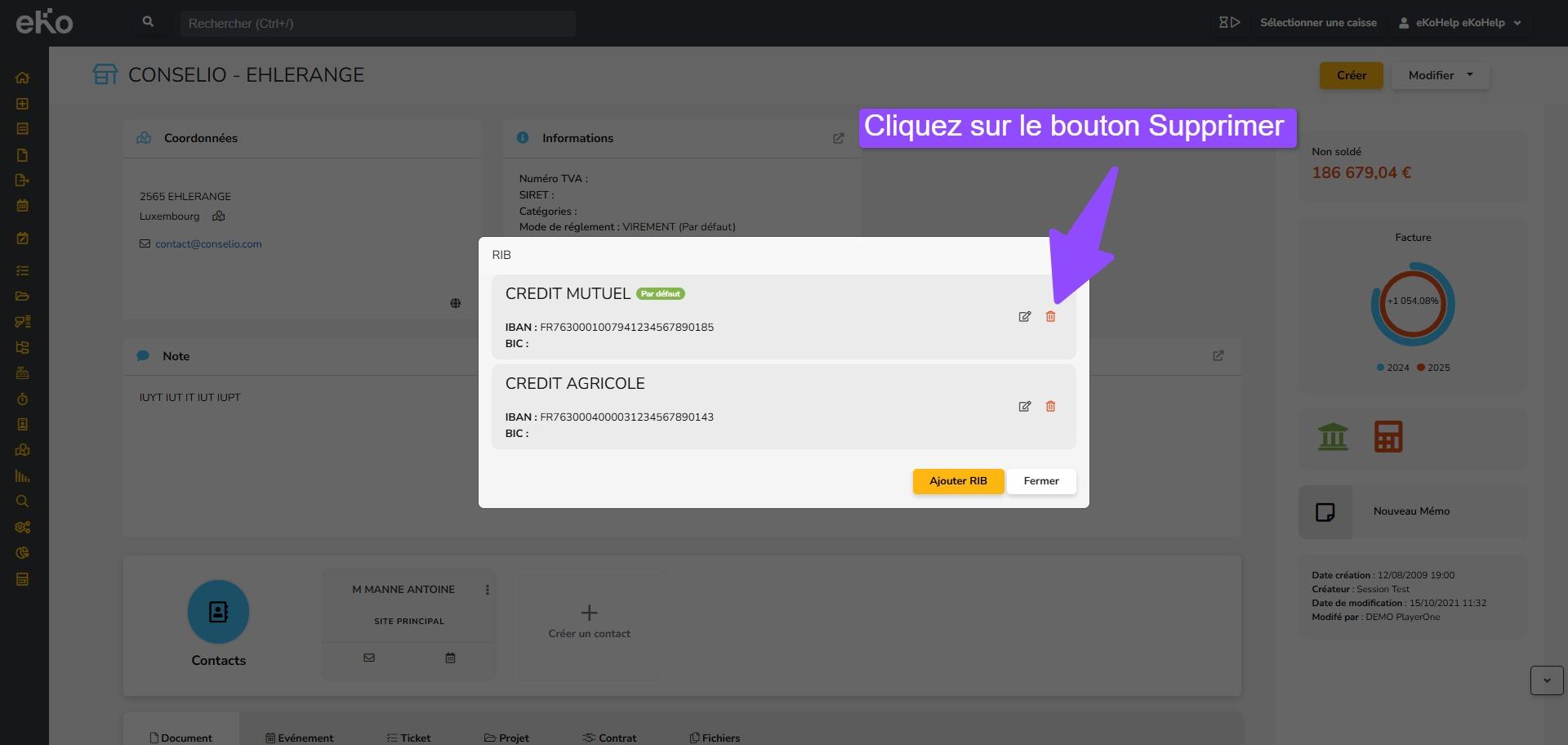 - Pour supprimer un RIB, cliquez sur l’icône Supprimer.
