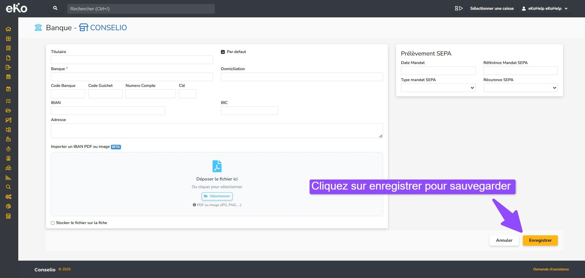 - Banque : spécifier le nom de la banque du client (champ obligatoire).