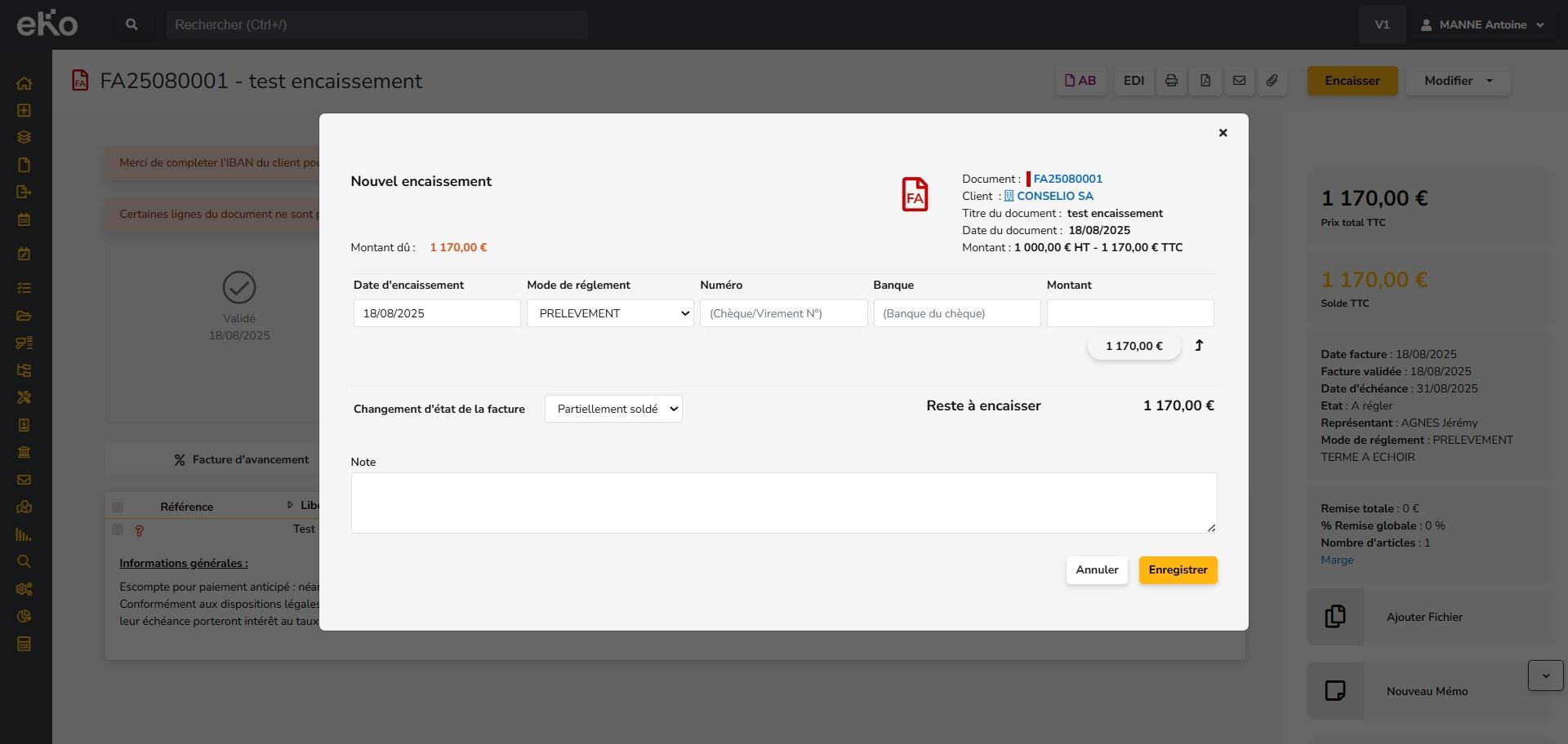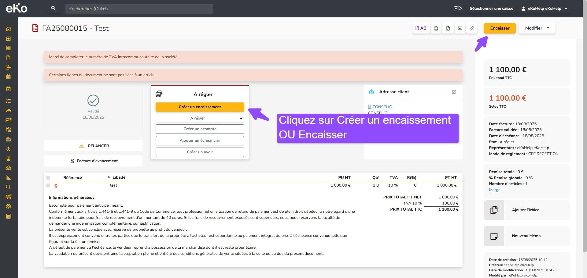 - Après enregistrement, eKo affiche une vue synthétique de la facture. La facture apparaît désormais comme Validée et Soldée. Sous la synthèse de la facture, un tableau récapitulatif de l’encaissement enregistré est affiché.