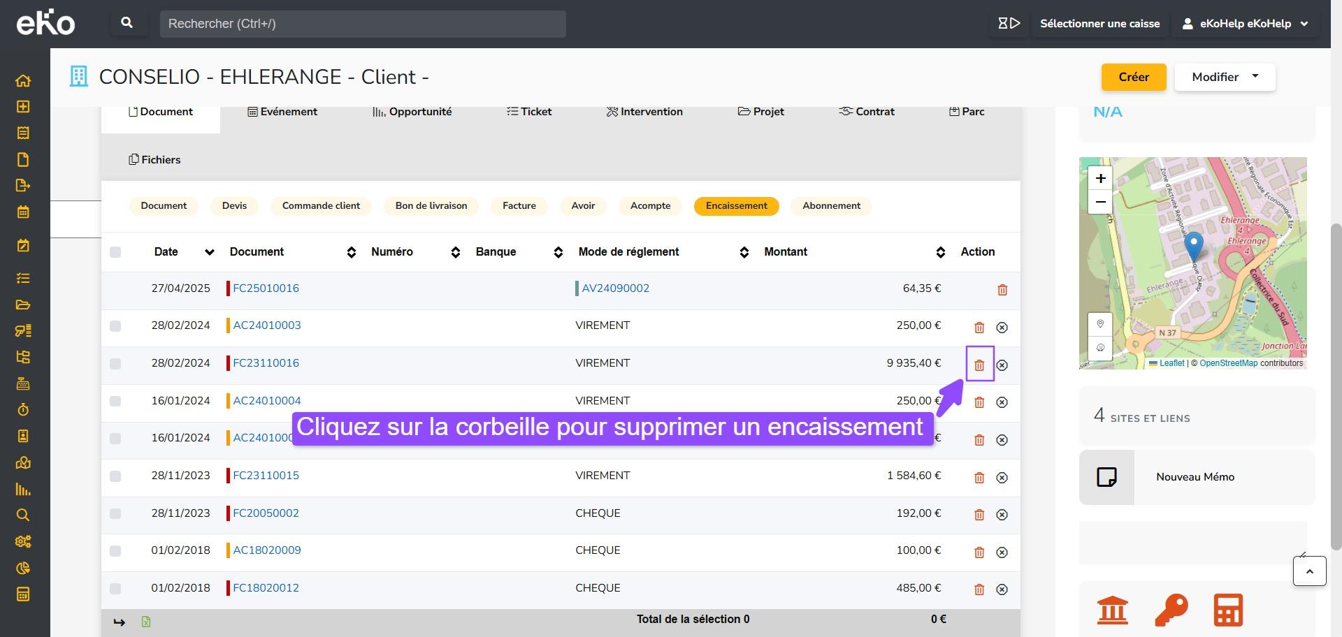 - Sélectionnez l’encaissement souhaité et cliquez sur la corbeille rouge.