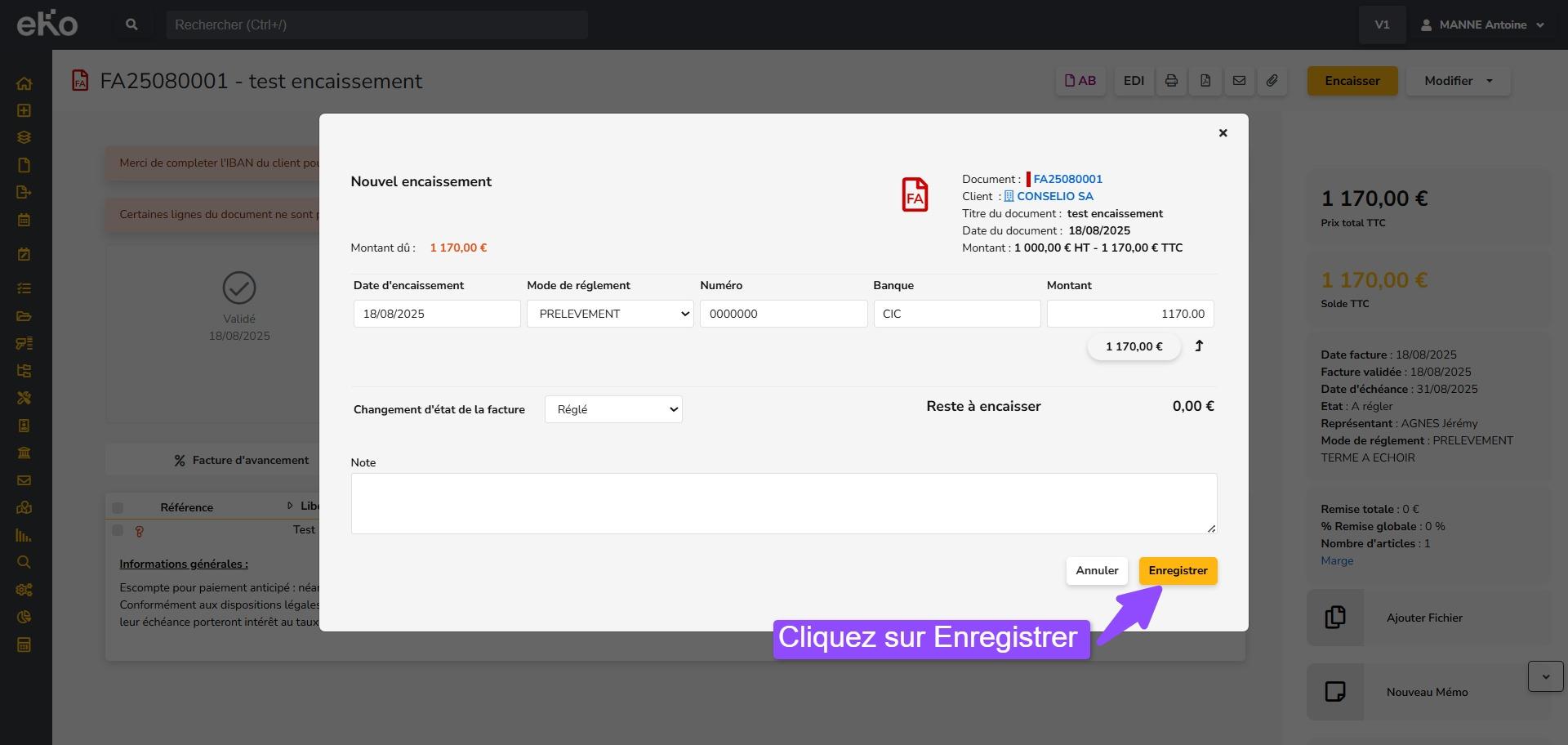 - Cliquez sur Enregistrer pour valider l’encaissement.