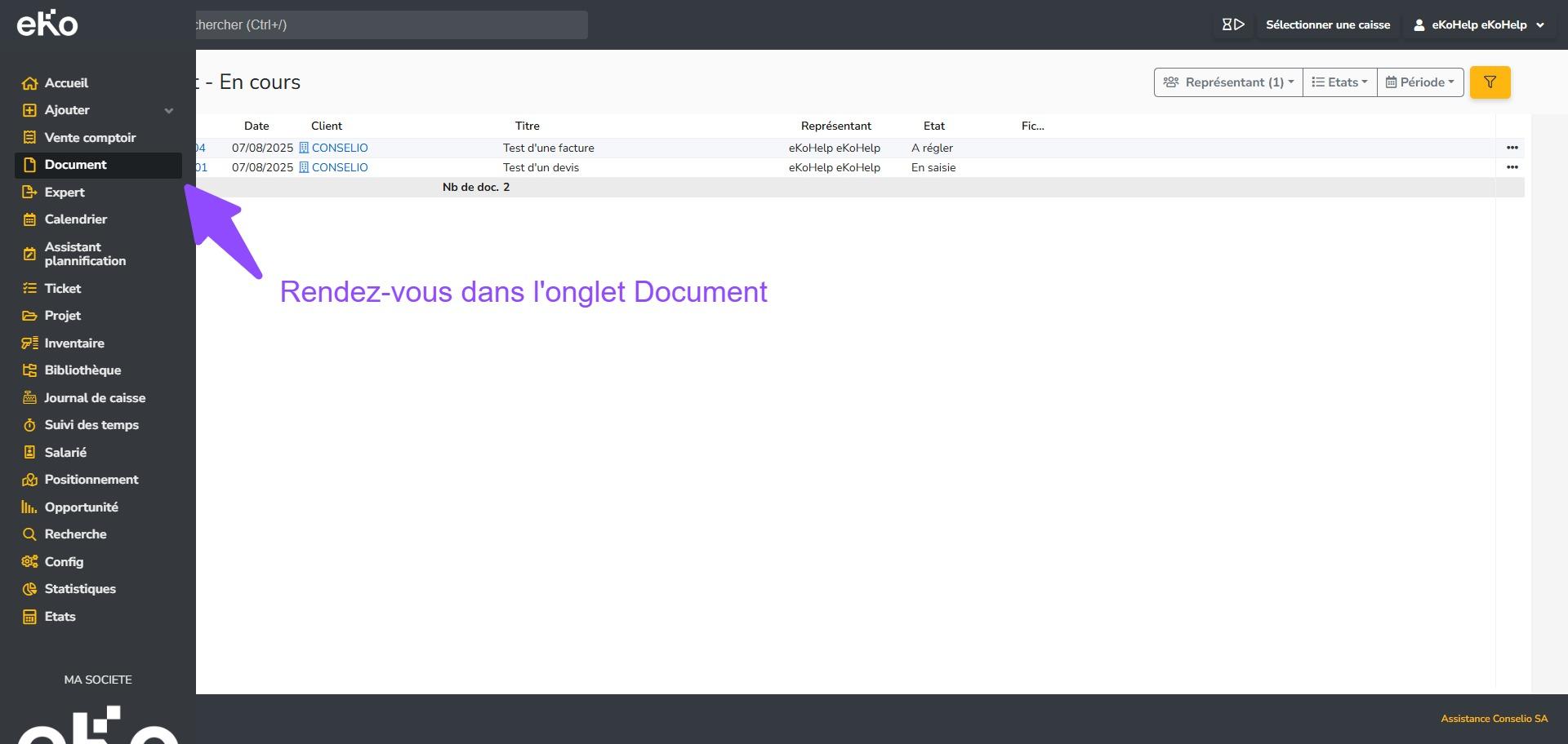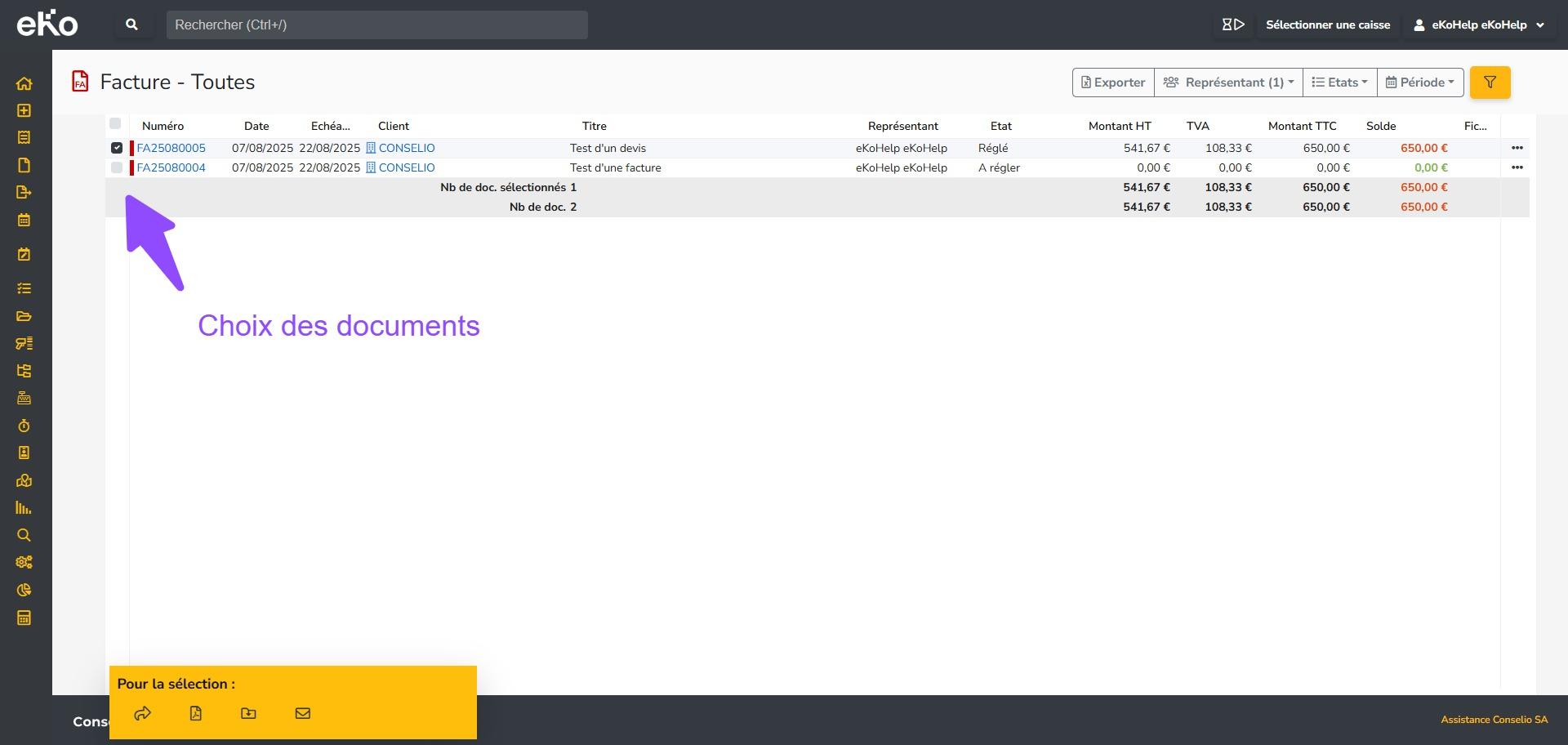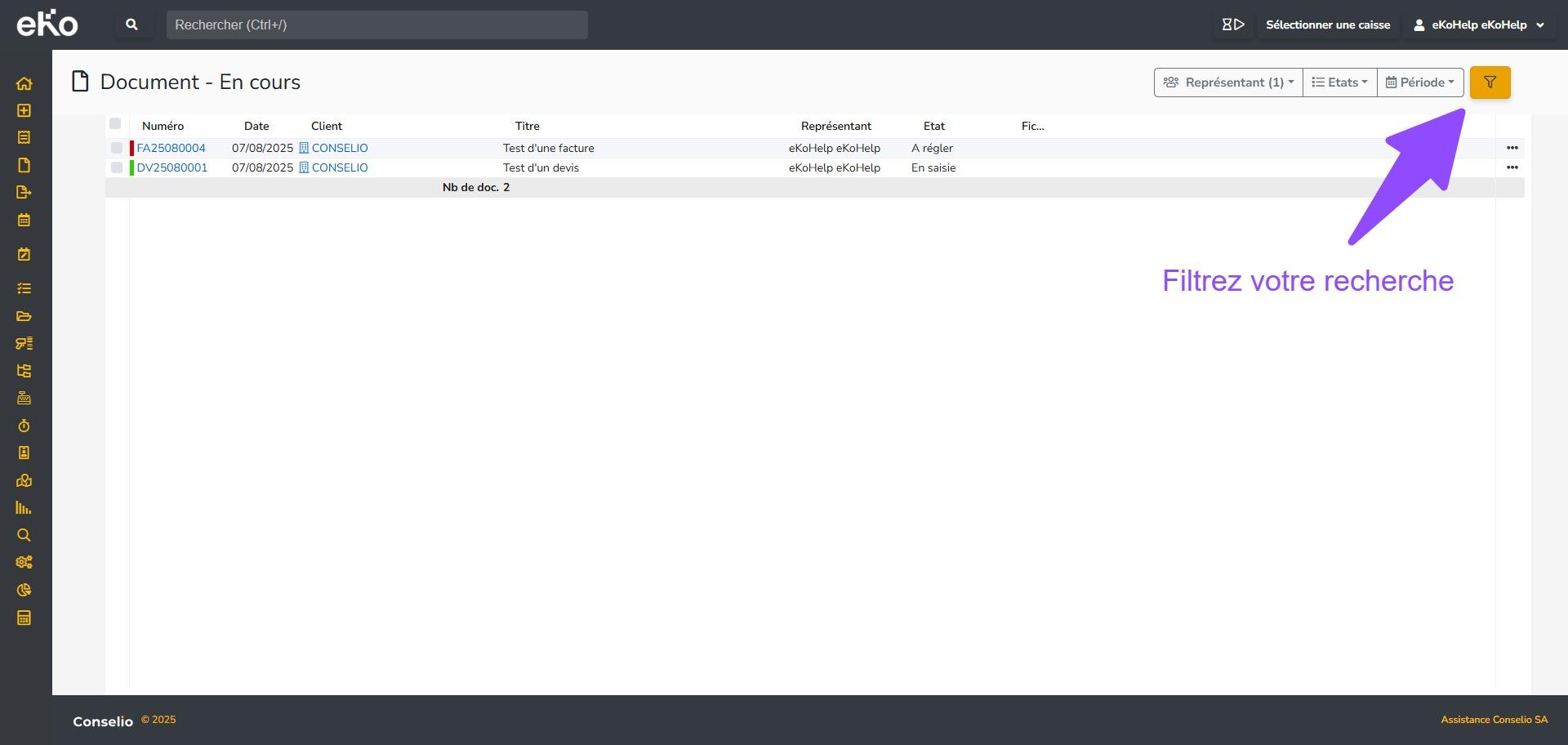 - Filtrez votre recherche en cliquant sur le bouton jaune de filtre, puis sélectionnez les documents souhaités (devis, commande client, bon de livraison, facture, avoir, acompte, abonnement…). Vous pouvez également, en haut de page à droite, triez les résultats en choisissant le ou les représentant(s), l’état du document et la période dans le calendrier.