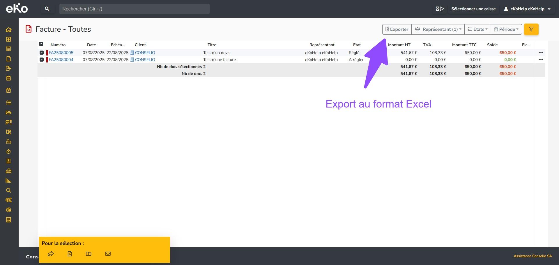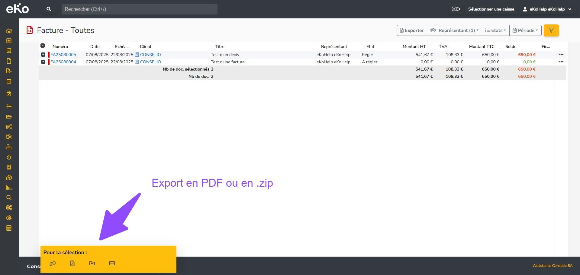 - Un export sous format PDF de l’ensemble des documents (encart jaune en bas à gauche).