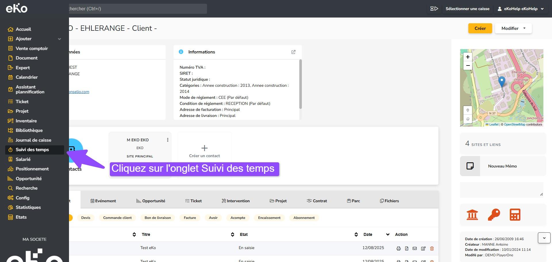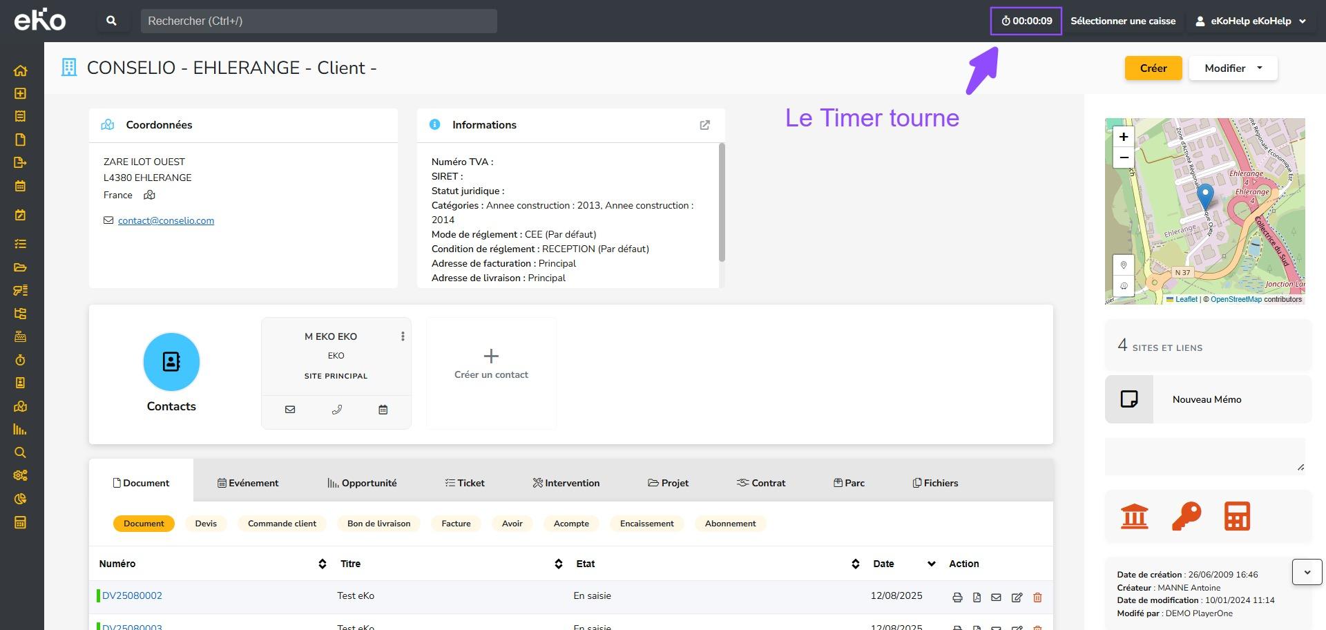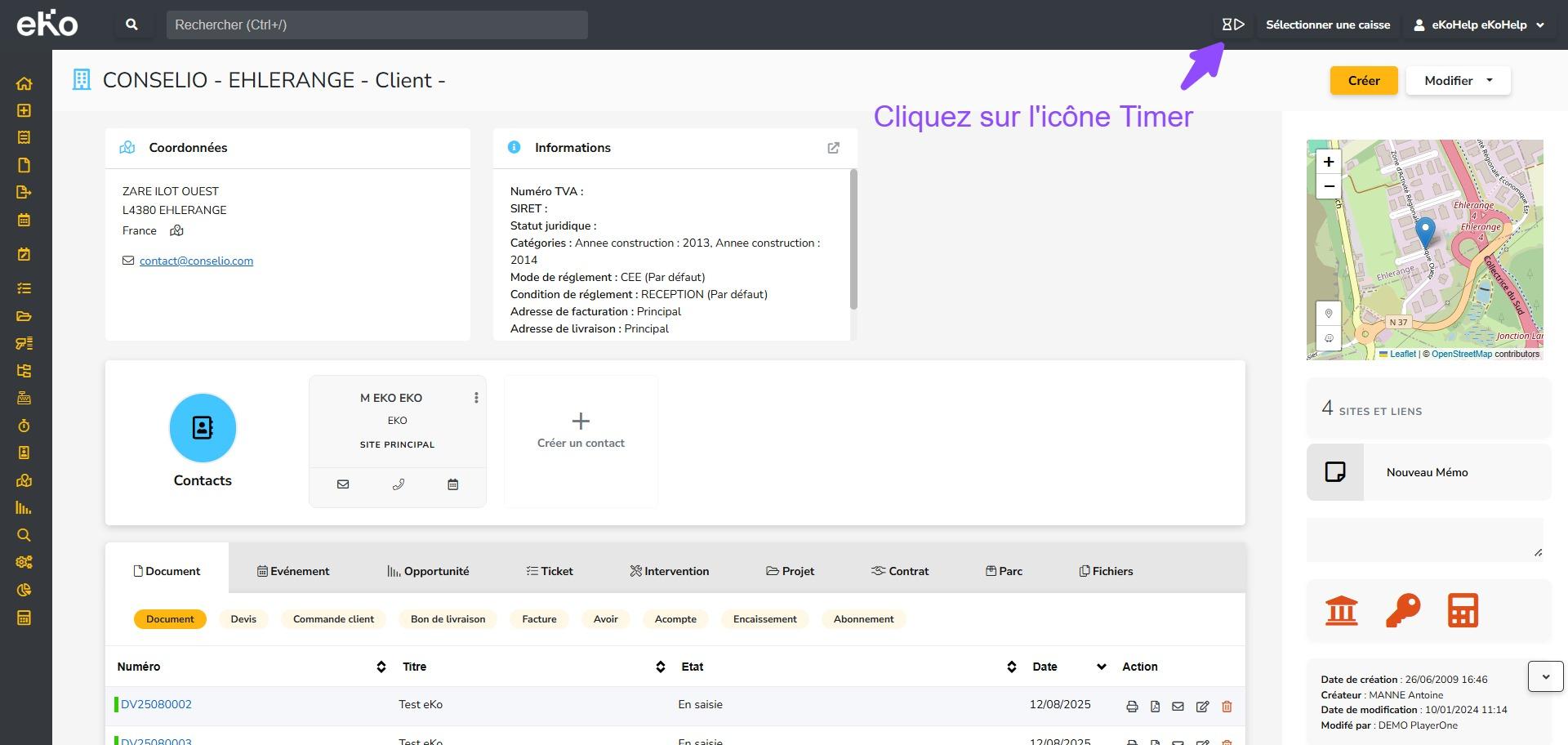 - Rendez-vous sur la fiche de votre client, puis cliquez en haut à droite sur le bouton Timer.