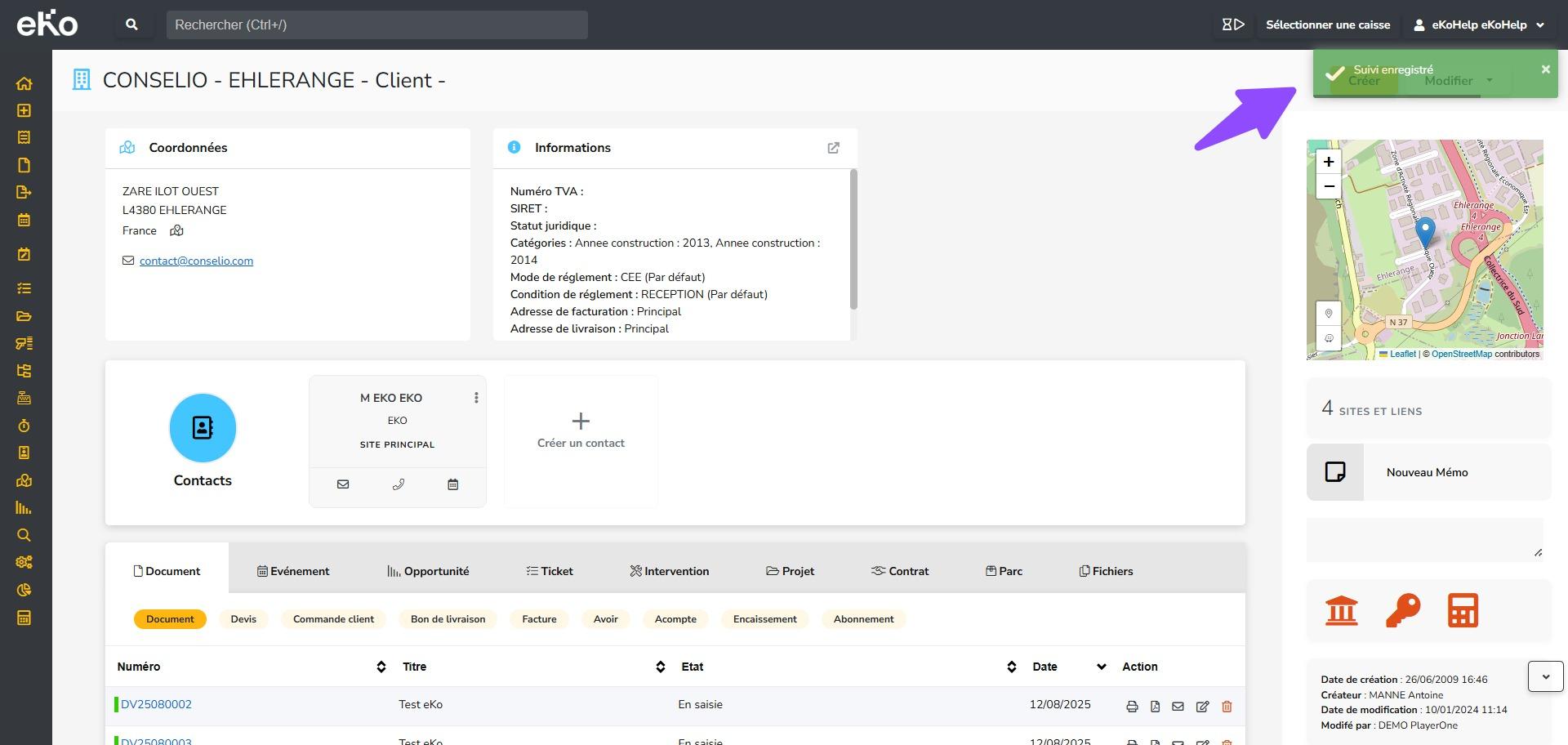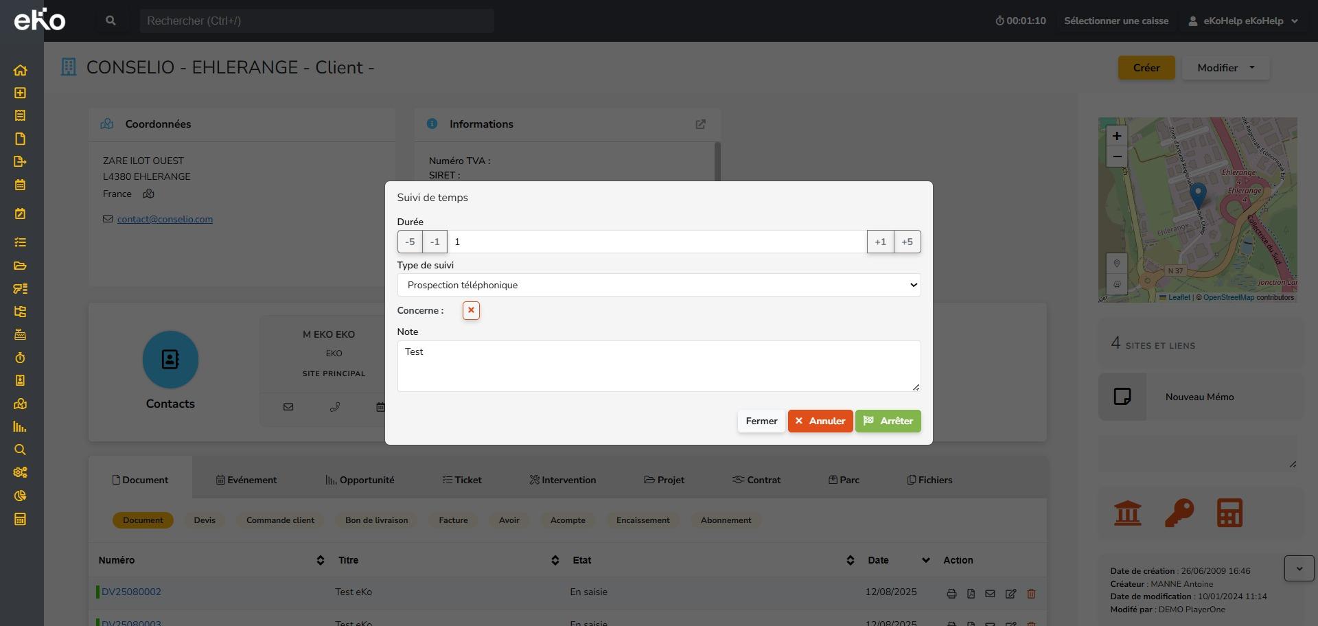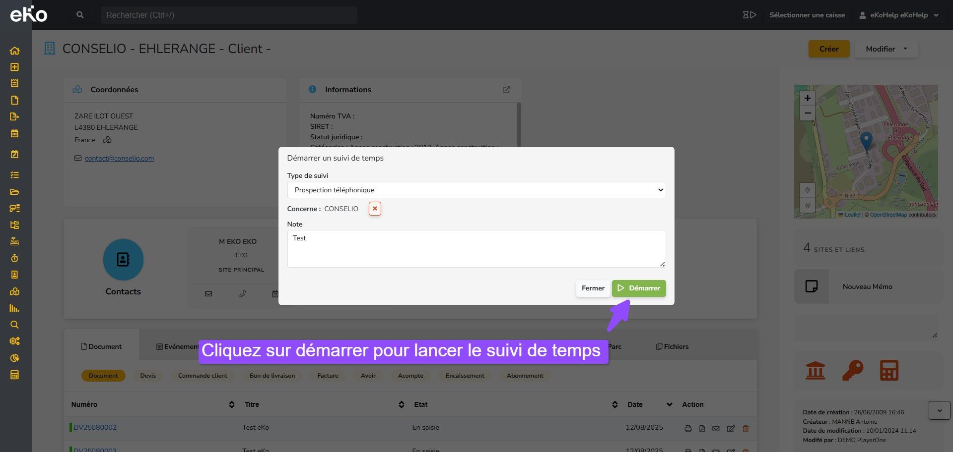 - Renseignez les informations nécessaires. Type de suivi, Client concerné, Note puis cliquez sur Démarrer.