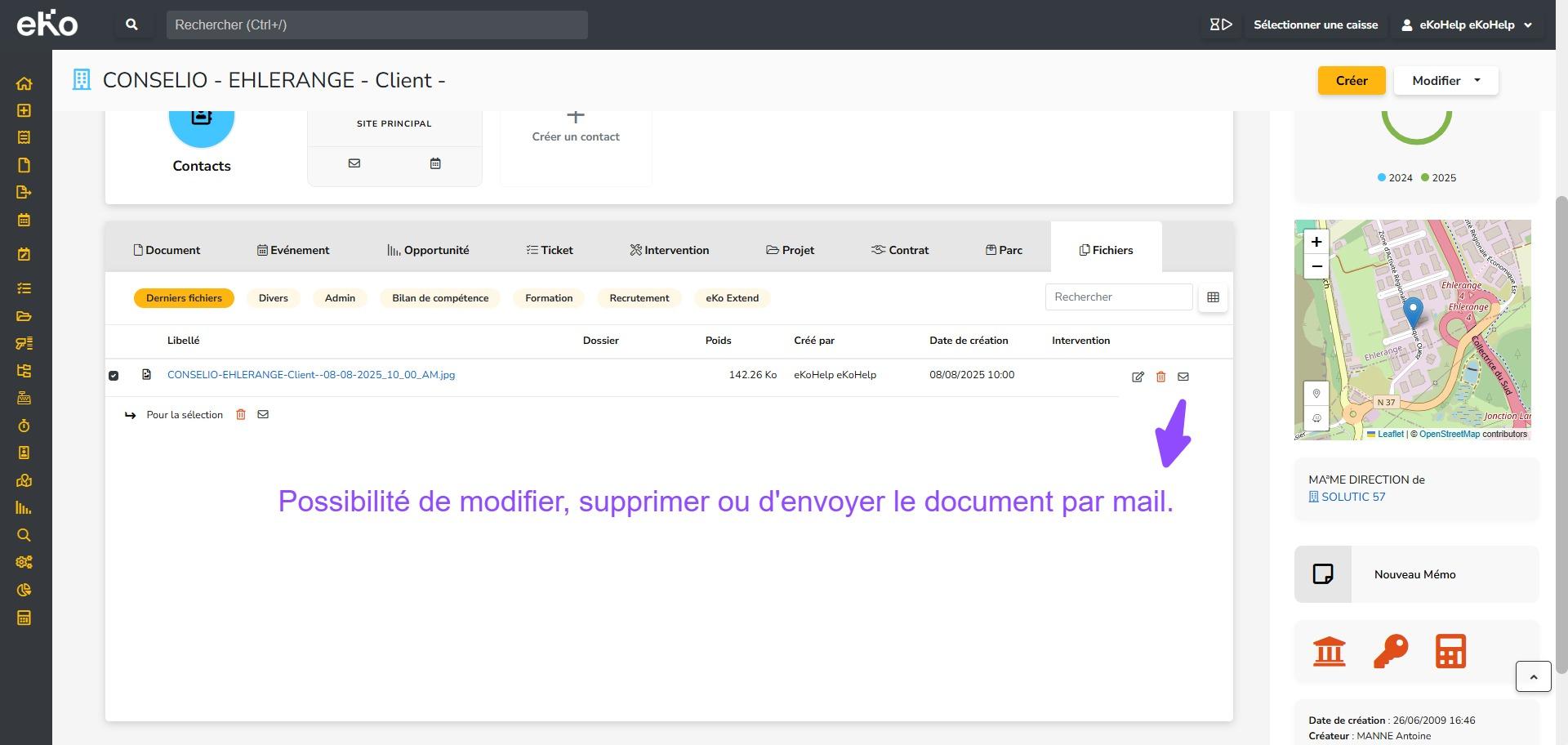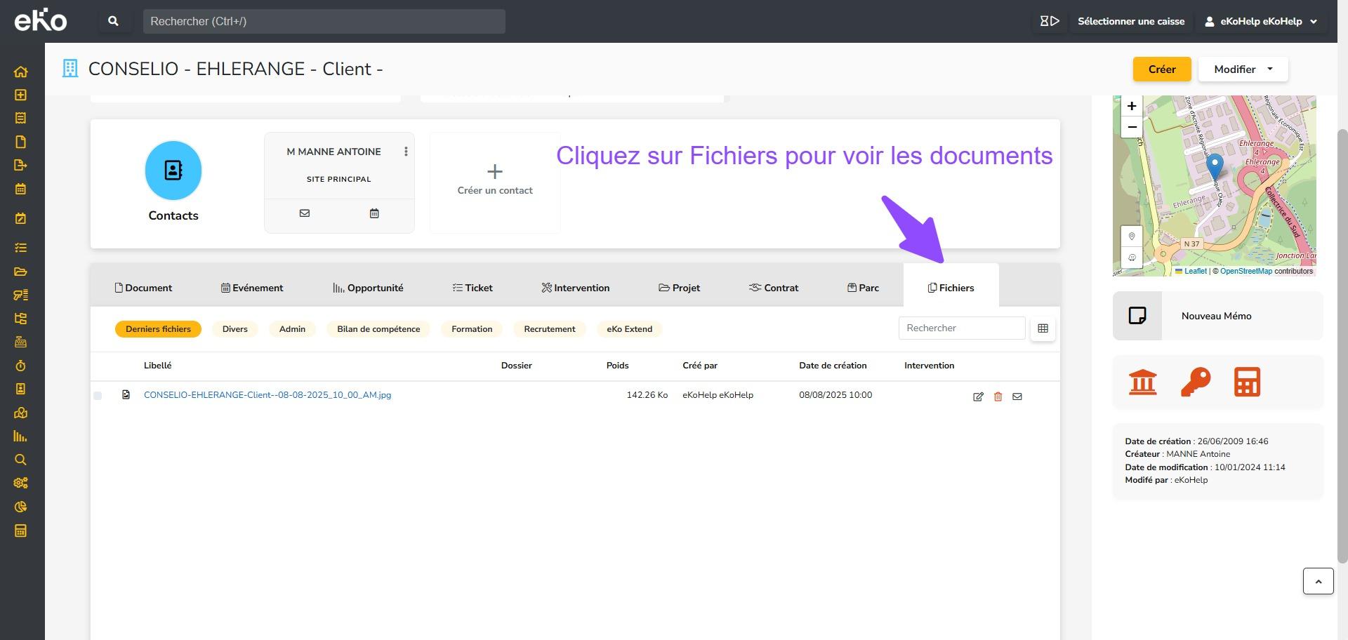 - L’onglet Fichiers dans les fiches Société (client, prospect ou fournisseur), permettant de stocker et consulter les documents liés à une société spécifique (par exemple : devis signé, contrat, documents administratifs).