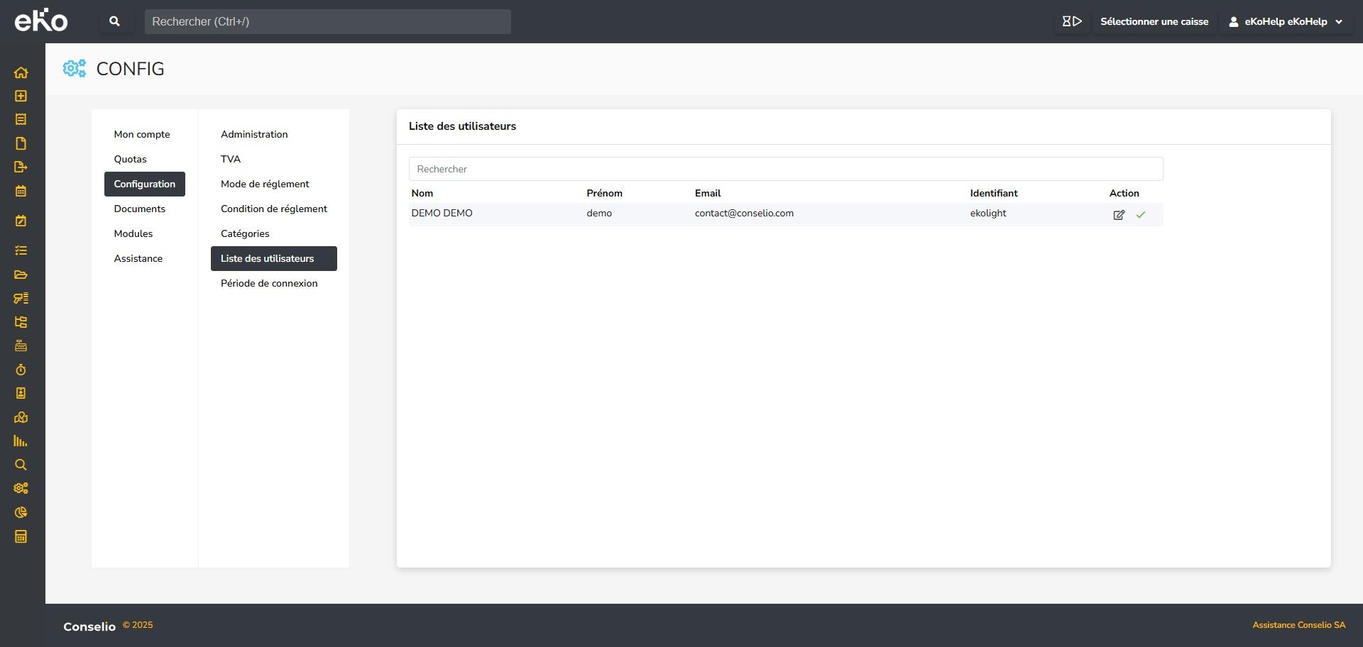 - Cliquez sur Configuration puis sur Liste des utilisateurs. La liste des utilisateurs s’affiche.