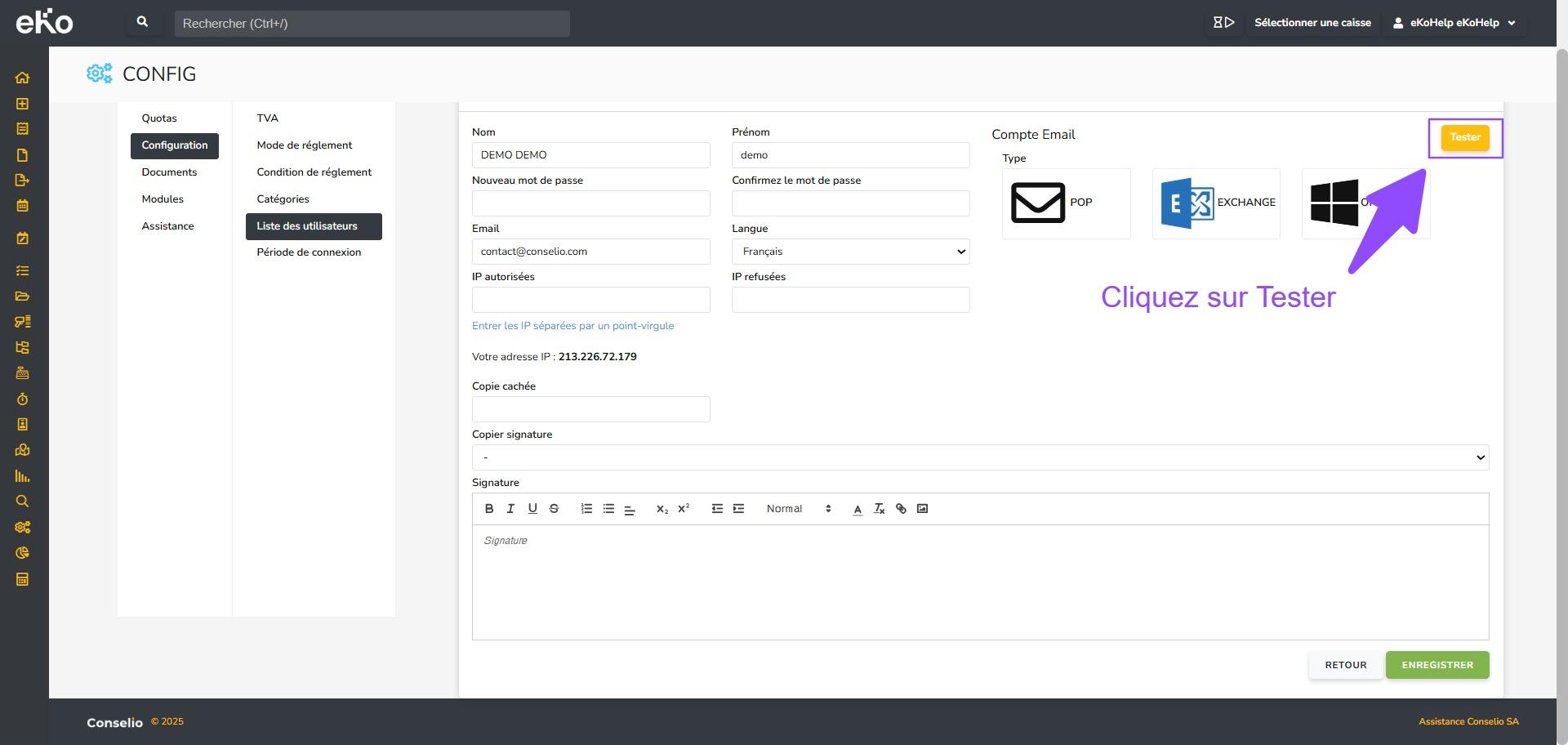 - Tester la connexion en cliquant sur le bouton jaune en haut à droite Tester. eKo vérifie la connexion avec les paramètres fournis, en cas d’erreur, vérifiez que toutes les informations sont correctes.