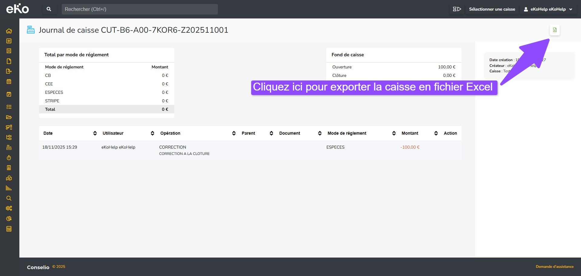- Une fois clôturé, vous pouvez exporter le journal au format Excel® pour archivage ou analyse.