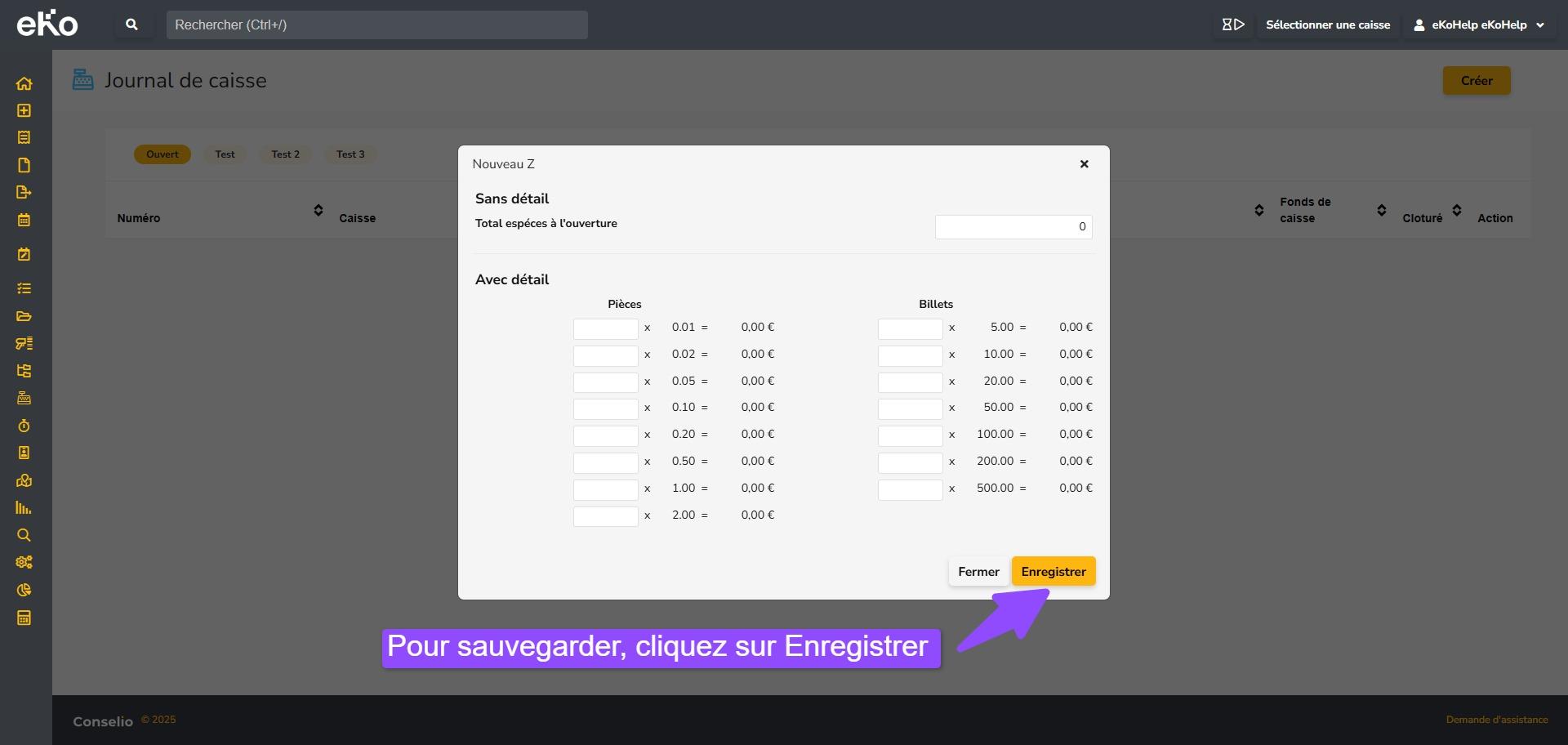 - Cliquez sur Enregistrer pour clôturer définitivement votre Journal de caisse.