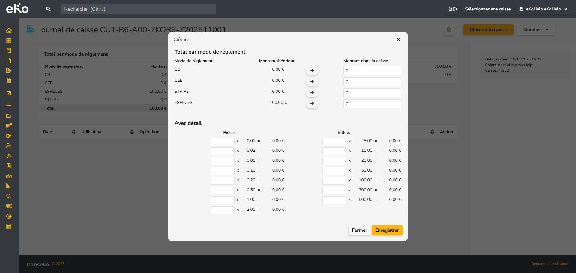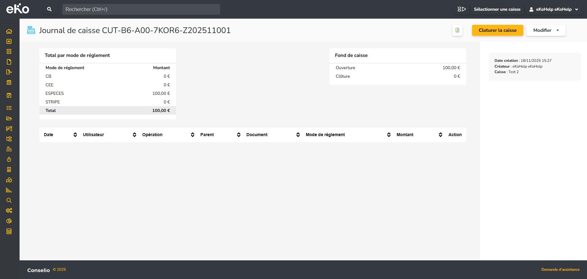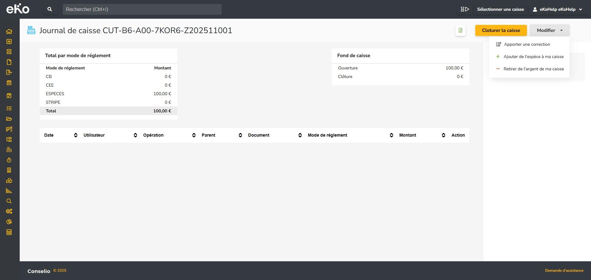 Le Journal de caisse est un module permettant de gérer les encaissements et décaissements en espèces. Il est obligatoire dans certains pays comme la France pour les professionnels acceptant les paiements en espèces. Ce module est disponible selon les modules activés dans votre entreprise par votre gestionnaire de compte interne. Merci de contacter votre gestionnaire pour toute demande d’ajout ou de suppression de module, car les équipes de Conselio SA ne traiteront aucune demande émanant d’un utilisateur non gestionnaire de compte.