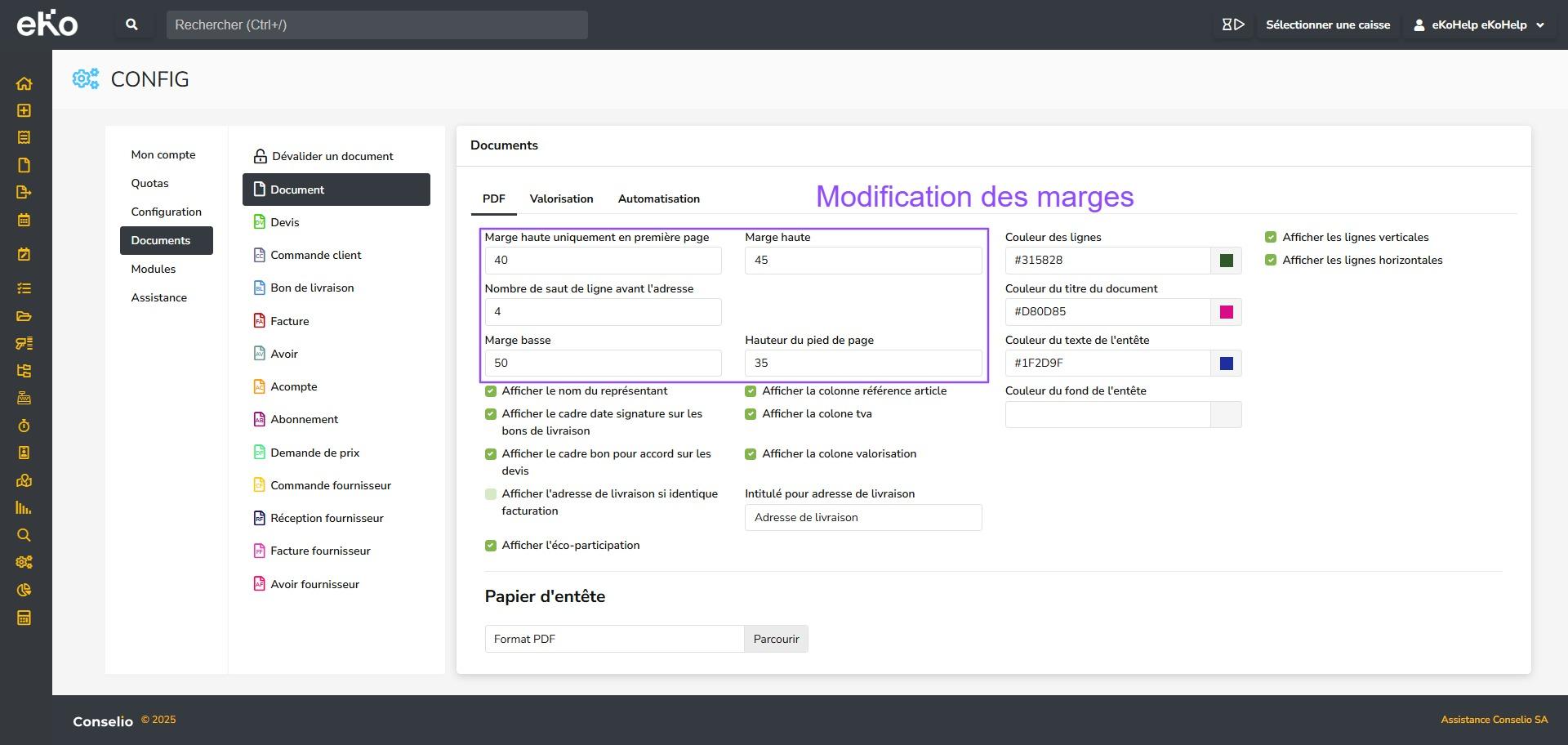 Nous vous conseillons de visualiser le nouveau template sur un document pour vérifier l’affichage (sur un devis déjà existant par exemple). En effet, il est possible que des marges soient à ajouter. Pour cela, rendez-vous sur un document lambda et visualisez-le en cliquant sur l’imprimante ou en le générant en pdf. Si des marges sont effectivement à ajouter, retournez dans Config > Documents > Document et modifiez les marges.